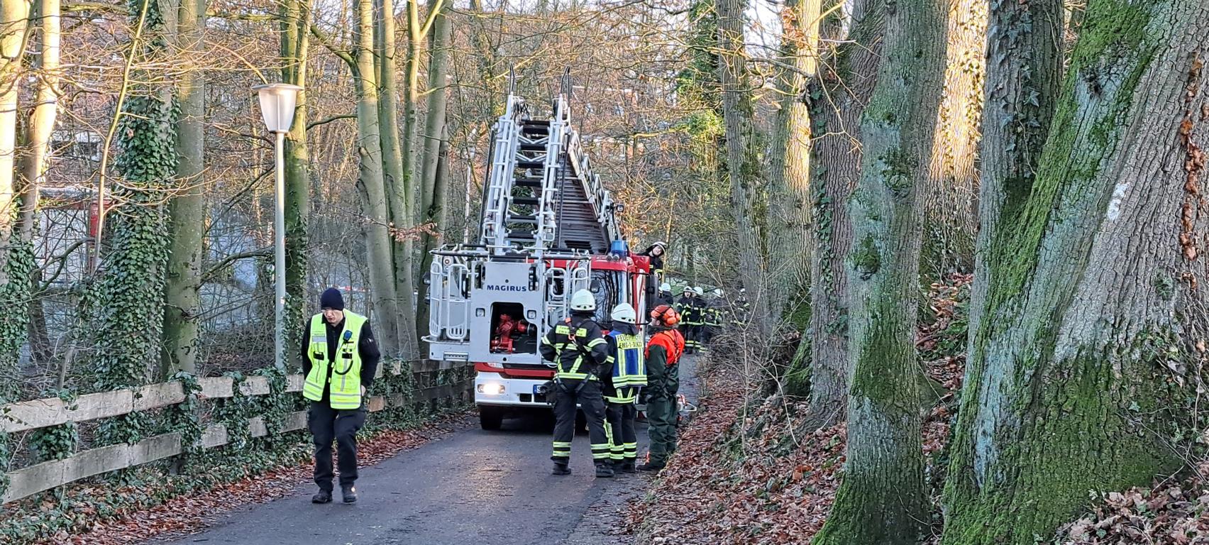 Mit Hilfe der Drehleiter gelangten die Einsatzkräfte sicher an den Ast und entfernten ihn fachgerecht. Während des Feuerwehreinsatzes war die Auffahrt zu den Kindergärten vorübergehend gesperrt.