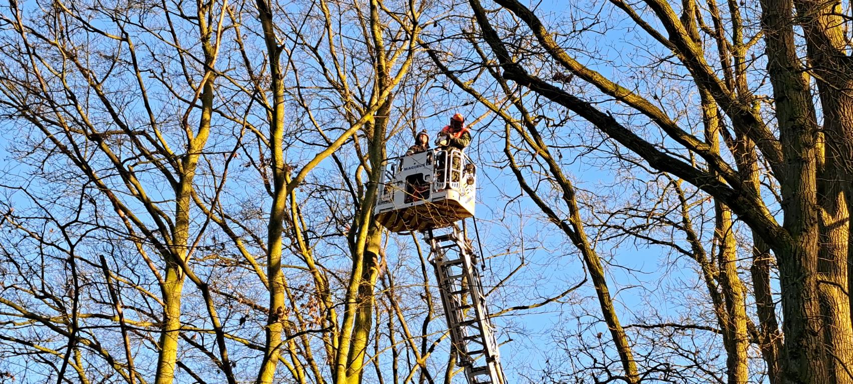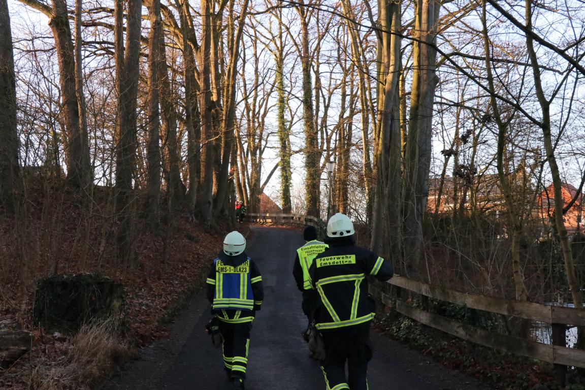 Das Ordnungsamt informierte daraufhin die Feuerwehr, um die Situation begutachten zu lassen. Da nicht ausgeschlossen werden konnte, dass der Ast herabstürzt und Personen gefährdet, wurde eine Drehleiter der Feuerwehr Emsdetten angefordert.