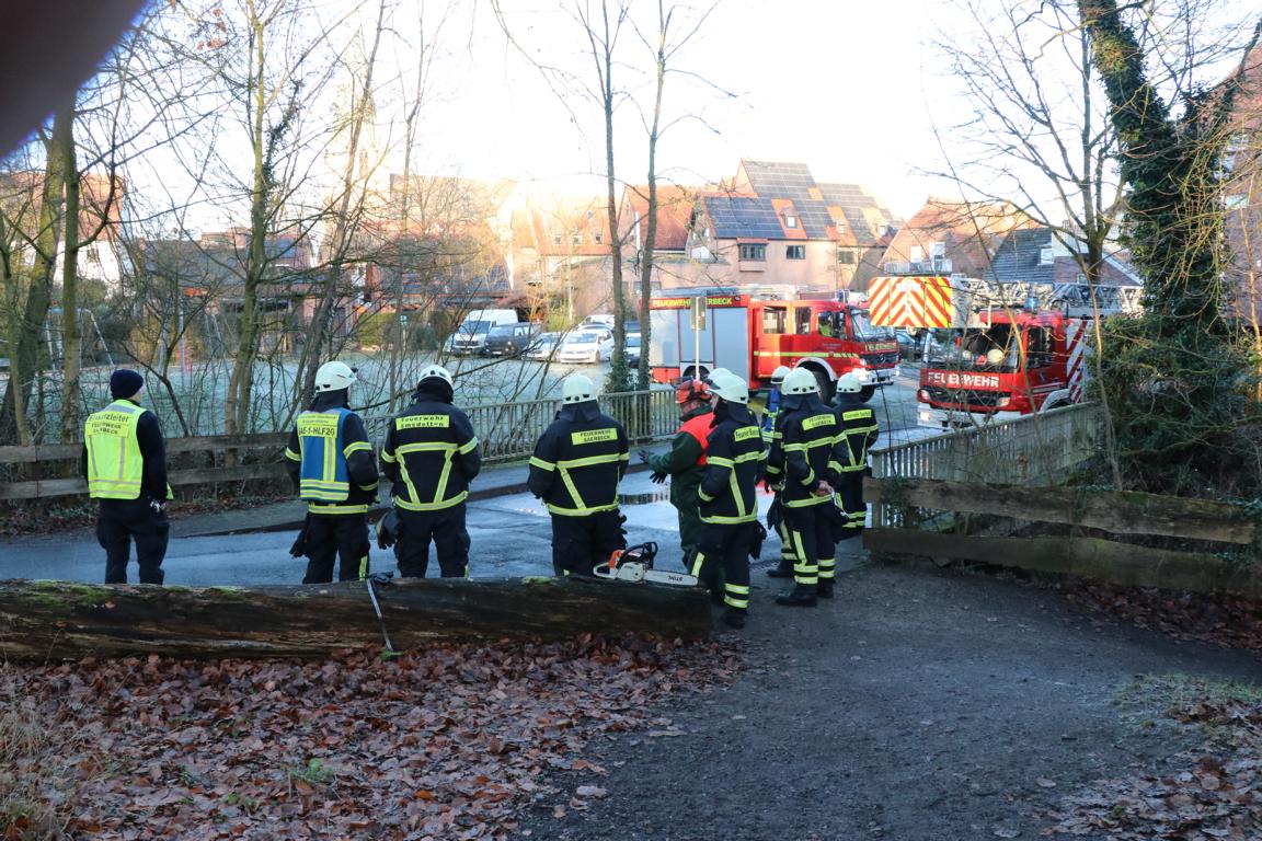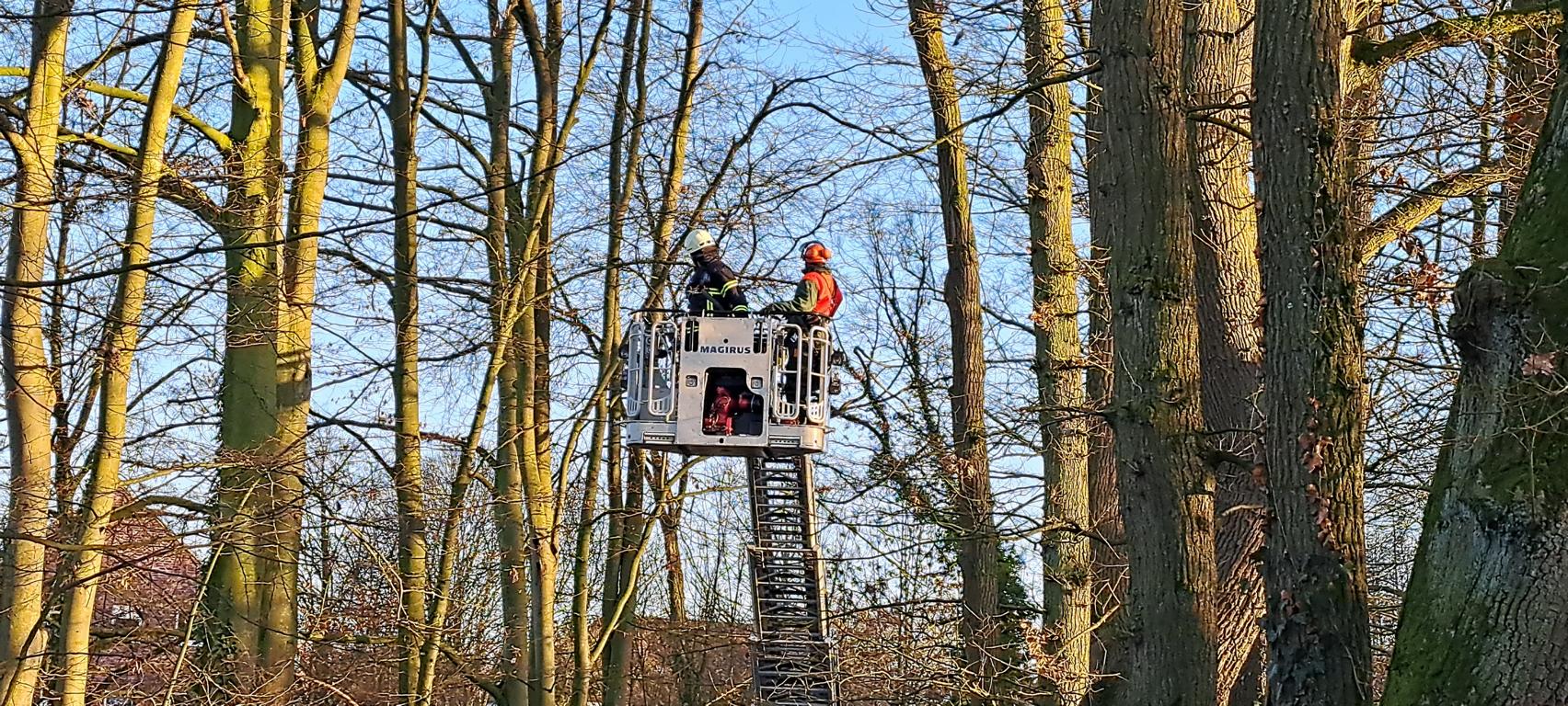 Das Ordnungsamt informierte daraufhin die Feuerwehr, um die Situation begutachten zu lassen. Da nicht ausgeschlossen werden konnte, dass der Ast herabstürzt und Personen gefährdet, wurde eine Drehleiter der Feuerwehr Emsdetten angefordert.